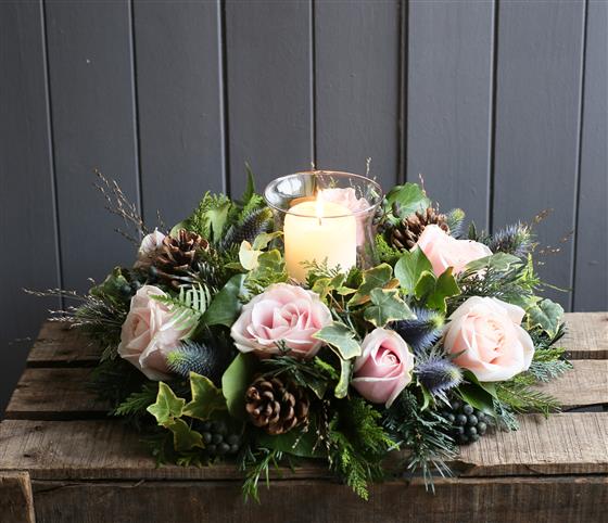 A beautiful Christmas arrangement using fresh seasonal flowers and foliage. The perfect Christmas gift.